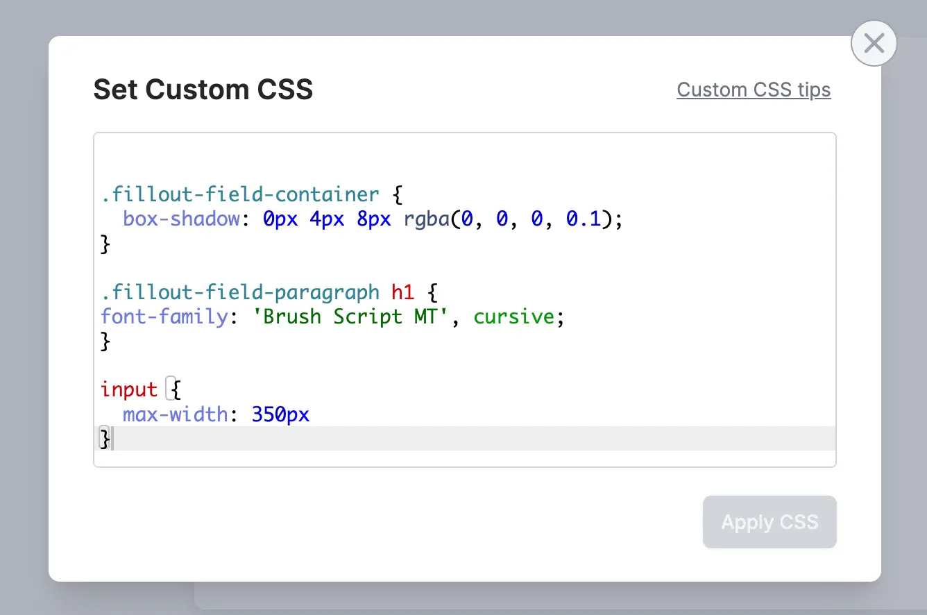 .fillout-field-[field-type] Examples: .fillout-field-short-answer .fillout-field-dropdown | Target specific field types | // Change the width of short answer fields .fillout-field-short-answer input { max-width: 350px; } |