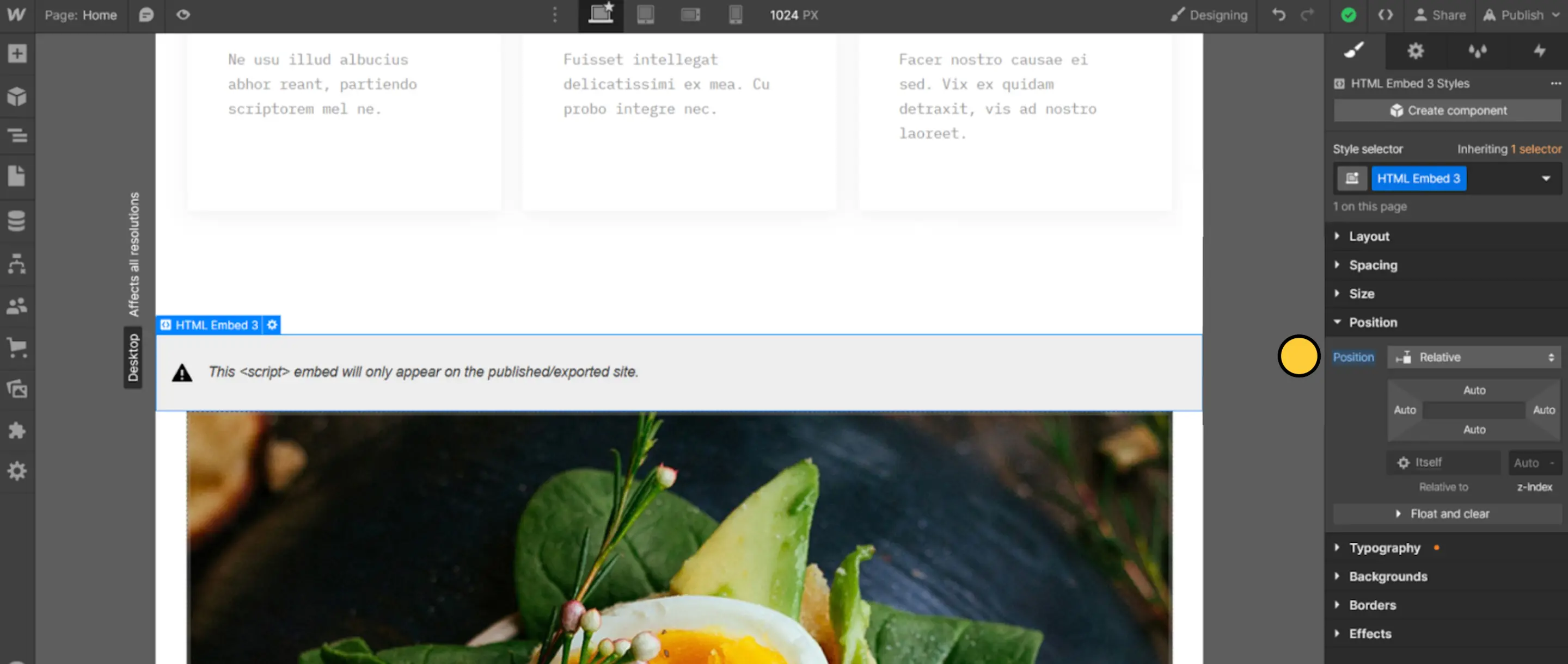 Embed element inside of a Div block (under Basic in the Add Elements sidebar) – almost anywhere on the page should work – and selecting Relative from the Position dropdown in the right Style sidebar.