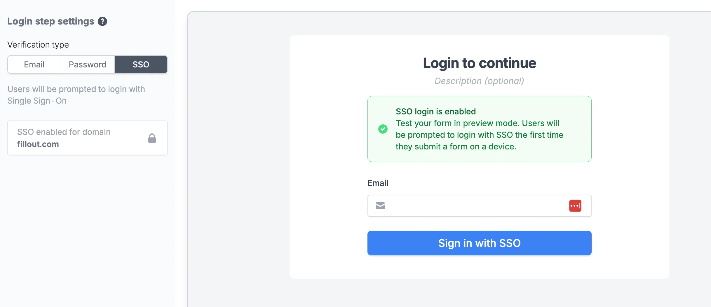 First, configure your single sign-on provider with Fillout. Next, add a login page to your form. Select the SSO option as the Verification type.